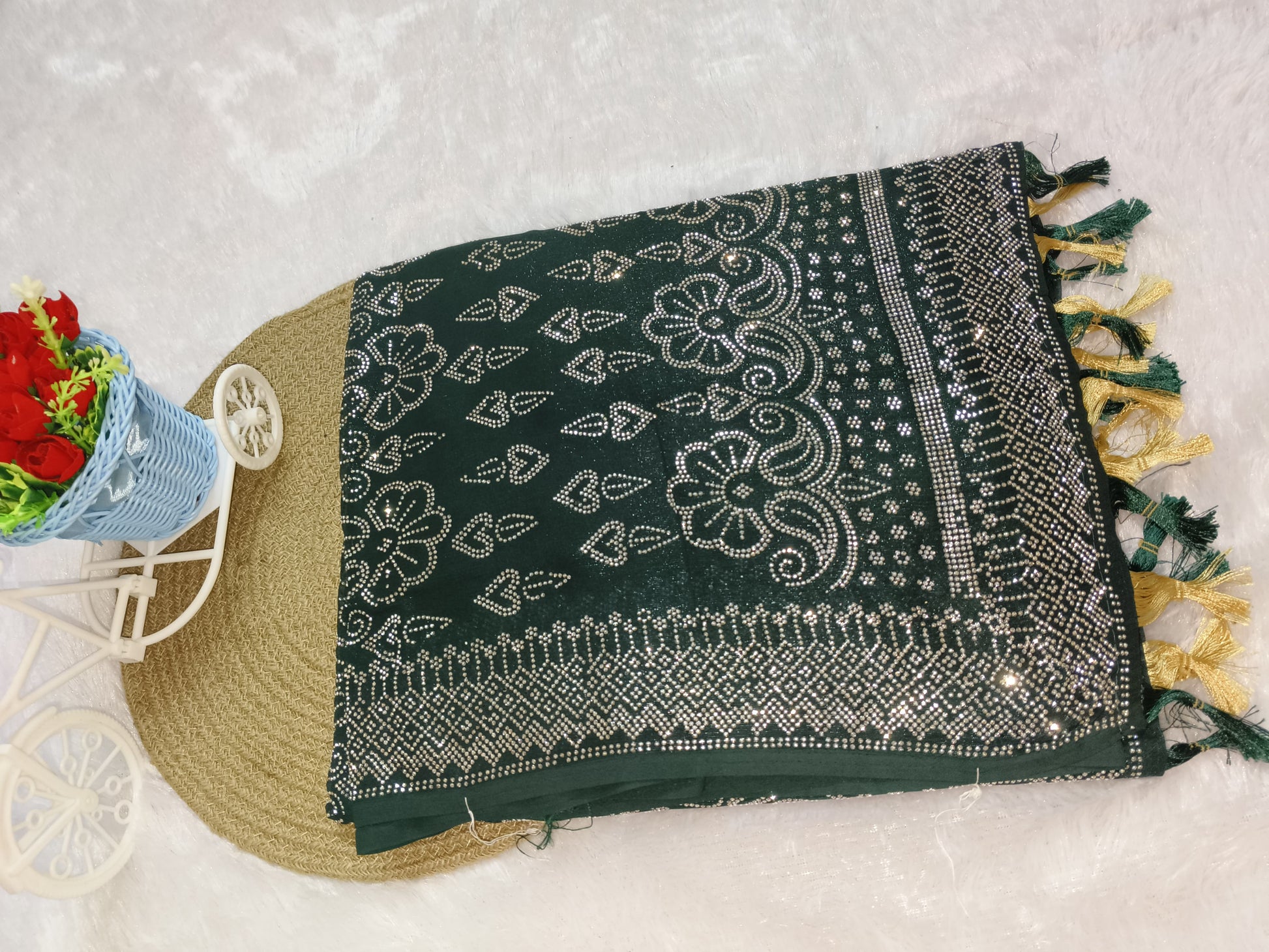 This Dark Green Heavy Siroski Work Chiffon Saree features heavy stone work and a beautiful flower pattern throughout, creating a luxurious and elegant look. Perfect for any occasion, this saree is also easy to carry. Add a touch of sophistication to your wardrobe with this stunning piece.