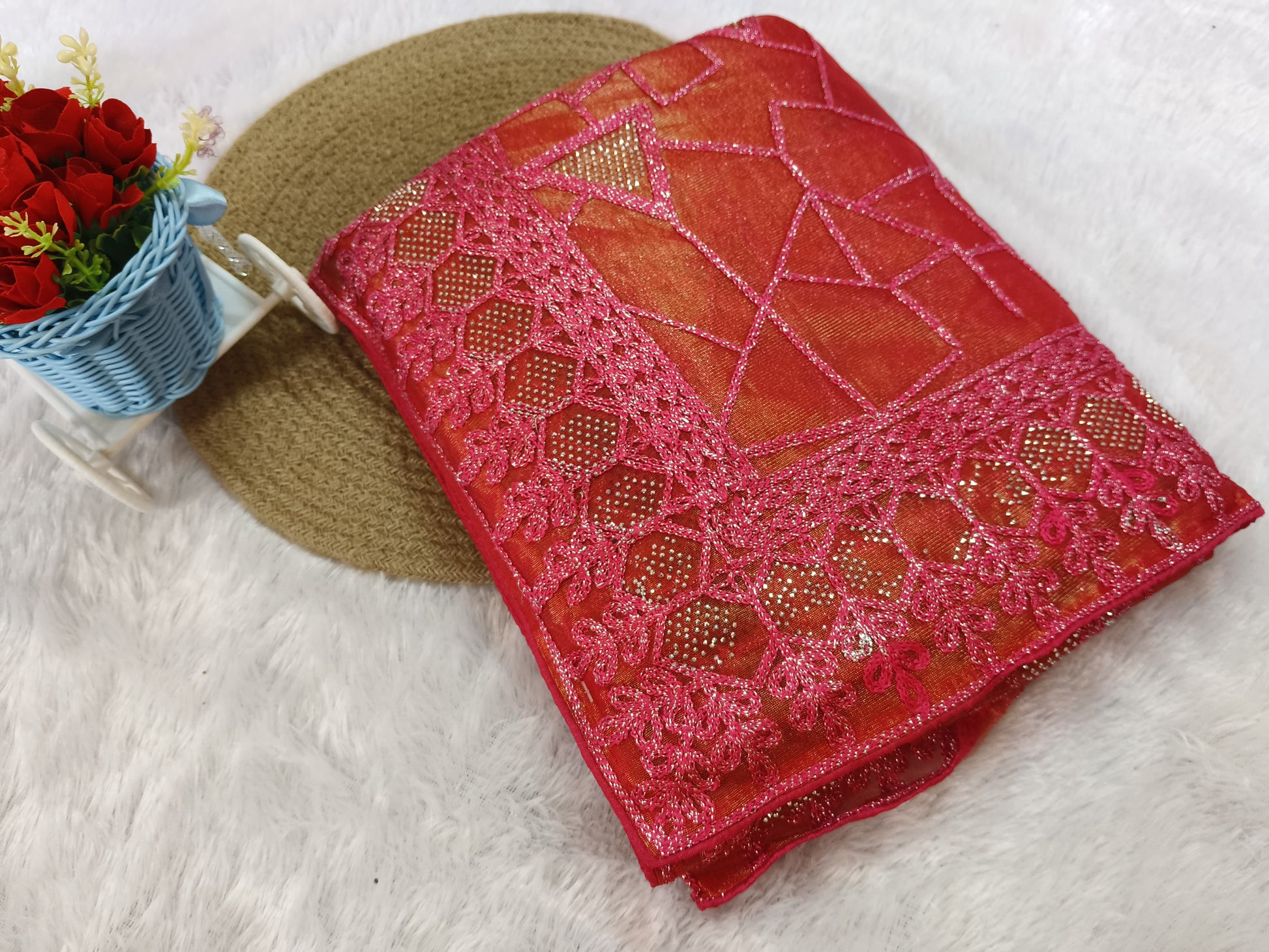 Elevate your party look with our Pink Zari Embroidery Organza Saree with following blouse. This light weight saree is expertly crafted with intricate zari embroidery, adding an elegant touch to your ensemble. Stay comfortable and stylish all night long in this must-have party piece.