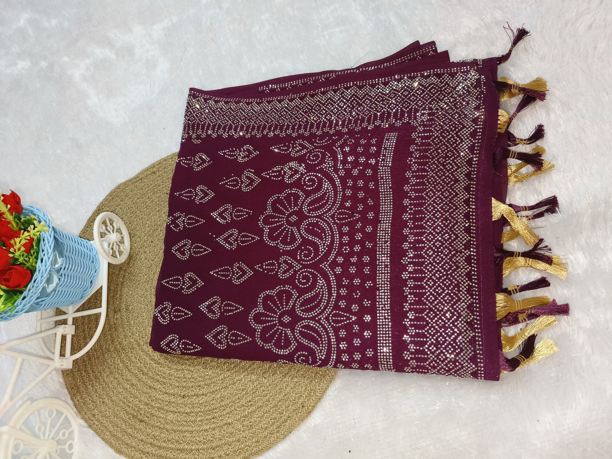 This Purple Heavy Siroski Work Chiffon Saree features heavy stone work and a beautiful flower pattern throughout, creating a luxurious and elegant look. Perfect for any occasion, this saree is also easy to carry. Add a touch of sophistication to your wardrobe with this stunning piece.