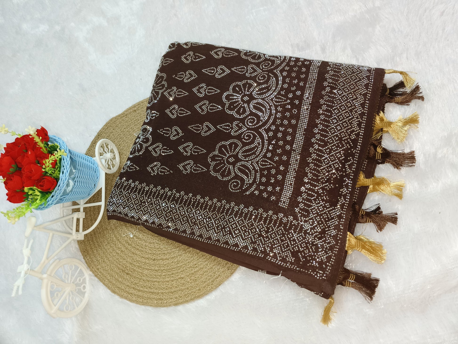 This Brown Heavy Siroski Work Chiffon Saree features heavy stone work and a beautiful flower pattern throughout, creating a luxurious and elegant look. Perfect for any occasion, this saree is also easy to carry. Add a touch of sophistication to your wardrobe with this stunning piece.