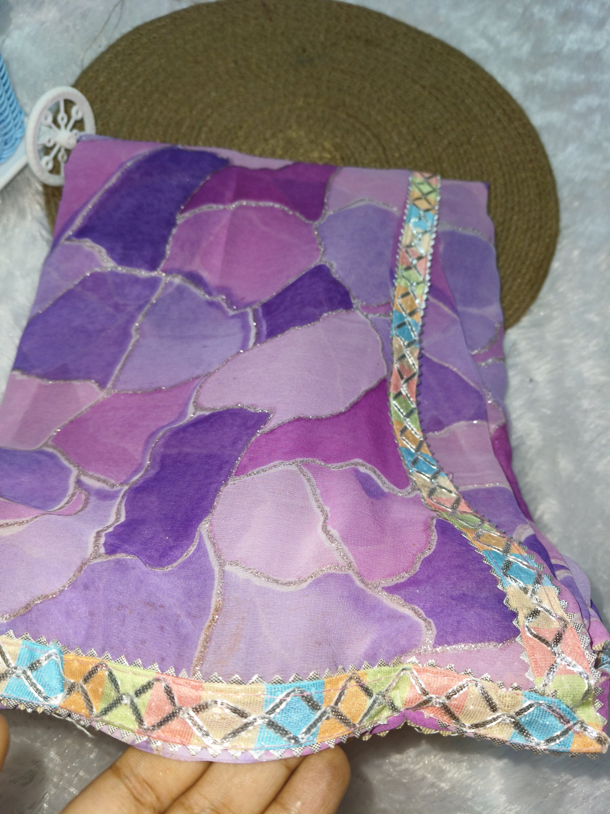 This light weight Stylum saree features a unique color block glitter print, perfect for any festival or outing. Its fancy gota work border adds a touch of elegance to this traditional garment. Stand out from the crowd with this eye-catching and comfortable saree.