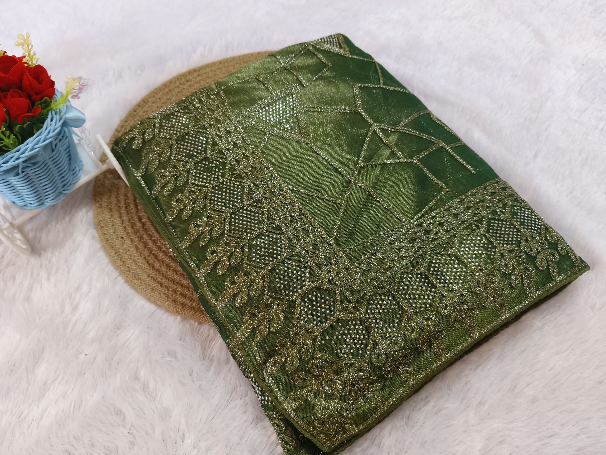 Elevate your party look with our Green Zari Embroidery Organza Saree with following blouse. This light weight saree is expertly crafted with intricate zari embroidery, adding an elegant touch to your ensemble. Stay comfortable and stylish all night long in this must-have party piece.