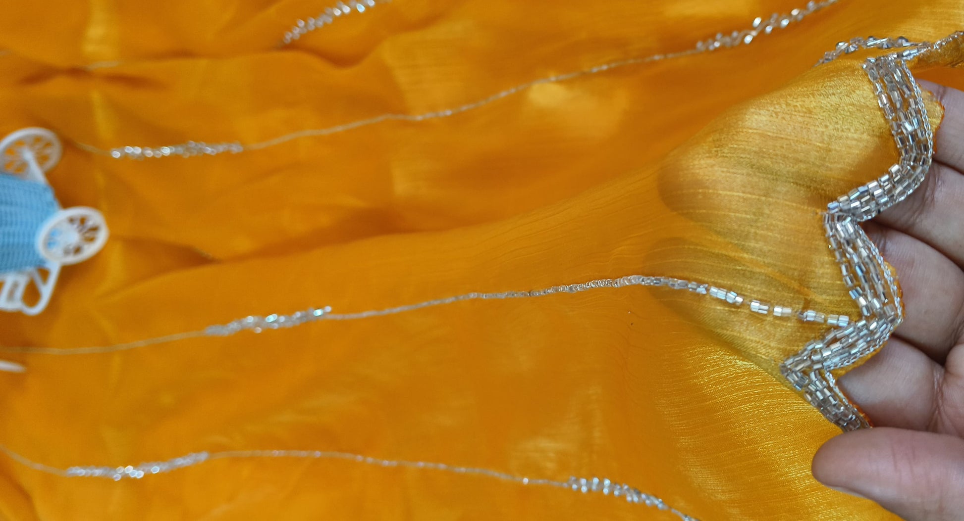 This Yellow color cut work Jimmy-cho saree features intricate handwork, offering a rich and luxurious look that is perfect for any parties. Elevate your style with this stunning saree and make a statement with its exquisite design. Perfect for any occasion, this saree is a must-have in your wardrobe.