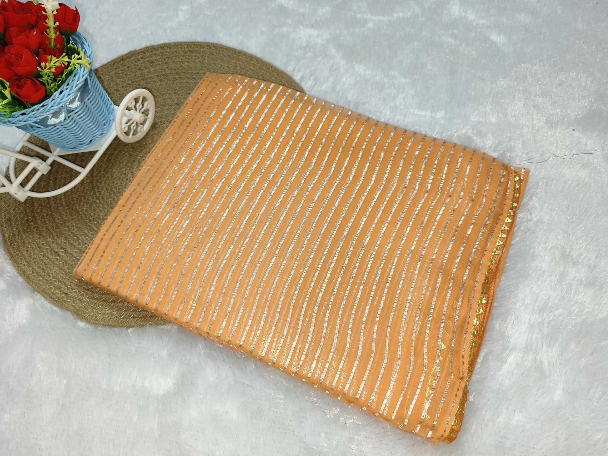 Effortlessly elegant, this Orange Zari Weaving Georgette Saree is the perfect combination of grandeur and simplicity. The intricate zari weaving and gold lace boarder adds a touch of luxury, making it suitable for both daily wear and special occasions. Experience the perfect blend of style and comfort with this exquisite saree.